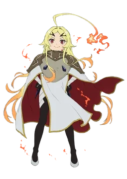 Her distinctive design combines elegance with a battle-ready aesthetic, featuring long golden-blonde hair, vivid red eyes, and a flowing white cloak accented with armor elements and symbolic markings. This contrast between her youthful, almost playful personality and her immense divine power makes her especially memorable among modern anime characters.